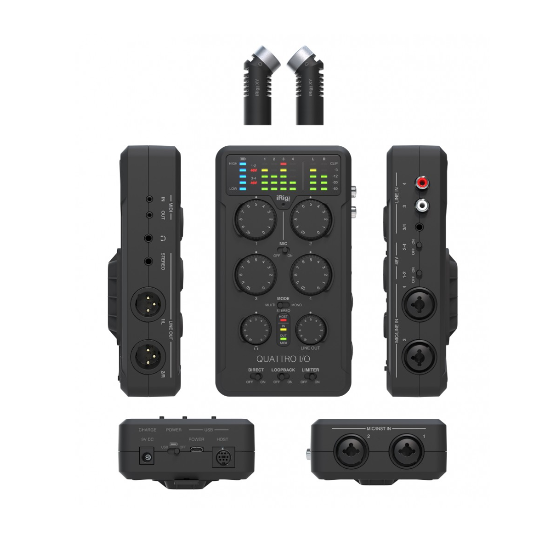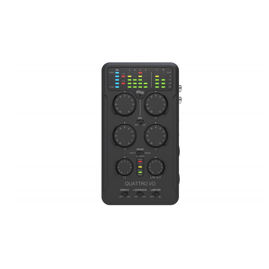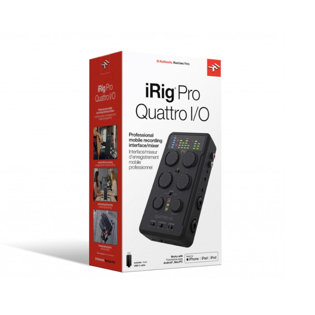 El iRig Pro Quattro I/O de IK Multimedia es una interfaz de audio y MIDI profesional de 4 entradas y 2 salidas, diseñada para grabación de campo, podcasting, streaming y creación de contenido en dispositivos móviles y computadoras. Es la versión más avanzada y completa de la línea iRig, funcionando tanto como interfaz como mezclador independiente.