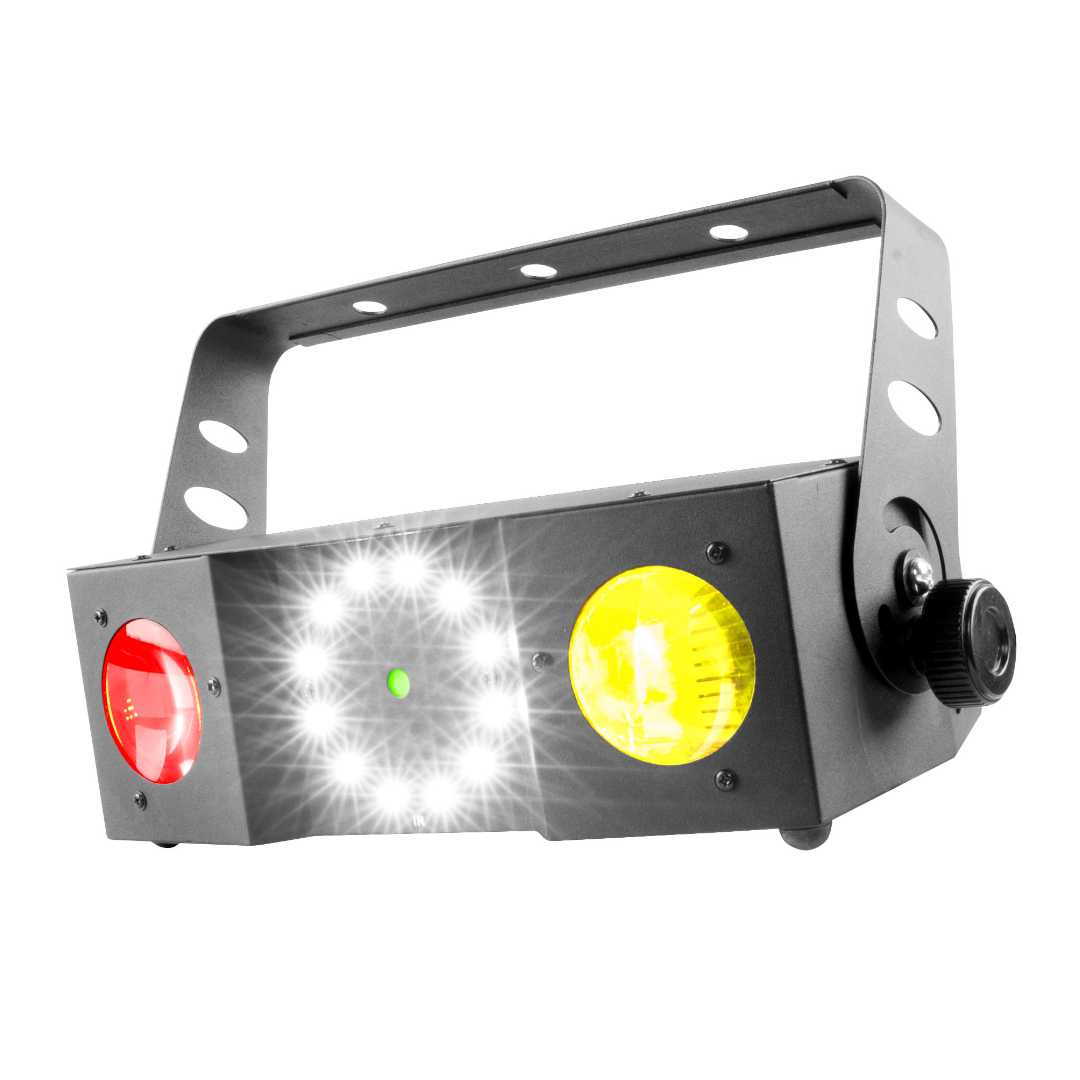 Este equipo compacto proyecta rayos vibrantes de colores que llenan toda la sala, mientras sus anillos de LEDs blancos crean efectos estroboscópicos eléctricos. Para rematar, sus miles de puntos láser rojos y verdes añaden una dimensión extra de impacto visual.